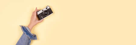 Banner with female hand holding old vintage photo camera on pastel yellow background with copy space for text. Trendy vintage photography. Online photography school concept, selective focus