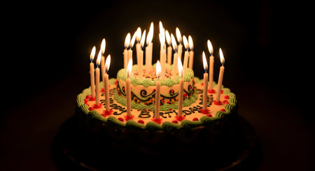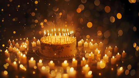 Glowing birthday cake surrounded by a mesmerizing ring of floating candles creating a magical luminous atmosphere perfect for a celebratory occasion The warm flickering flames cast a cozy