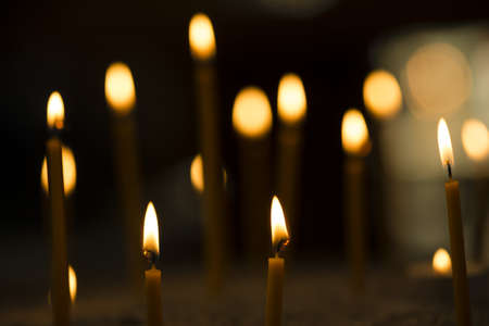Slow burning wax candles in church as a symbol of death memory. Dark macro close composition with shallow depth of field.