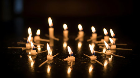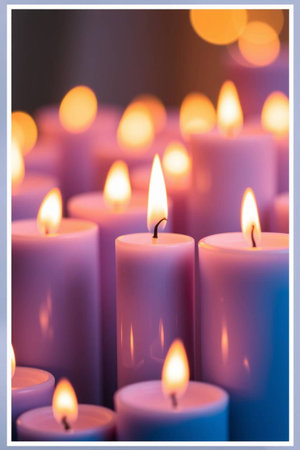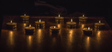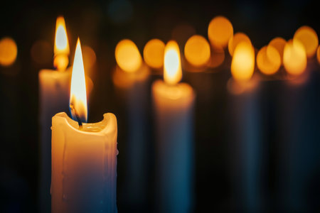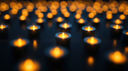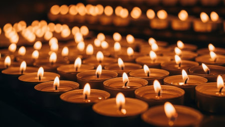 Soft light from flickering candles illuminates tranquil scene, inviting calming ambiance. Expression of regret, eternal memory and mourning. Religious ritual cult. Moments of reflection serenity. AI.