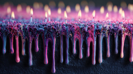 Capture the essence of celebration with this colorful cake featuring dripping wax and vibrant candles, creating a joyful and festive atmosphere perfect for special occasions.