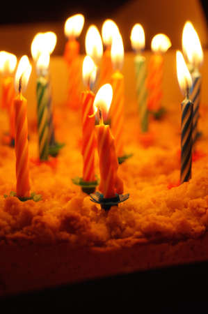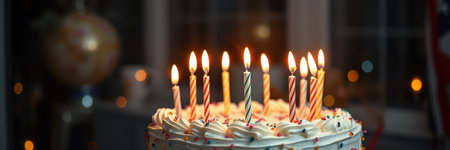 A birthday cake is illuminated by multiple lit candles. The visual displays a close-up shot of the decorated cake against a dark backdrop. The warm glow of the flames creates a celebratory atmosphere, suitable for various editorial and commercial applications. The composition highlights the cake's design.