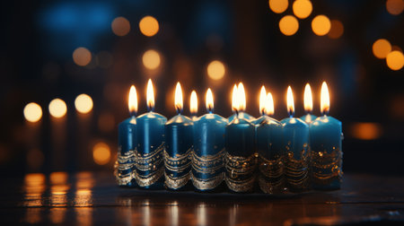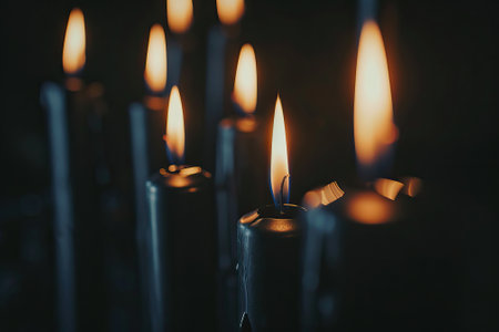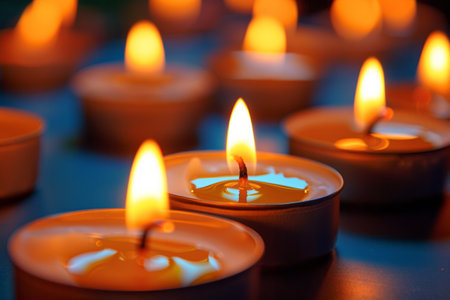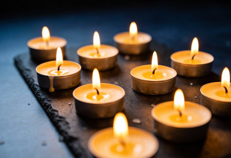 A row of flickering candles illuminates a dark room, creating a serene and calming atmosphere that enhances the sense of tranquility and warmth.