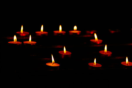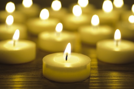 A collection of lit tea candles casting a warm glow in a dark setting, creating a peaceful and serene atmosphere.