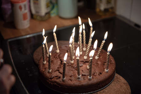 A beautifully decorated chocolate cake adorned with lit candles creates a warm and festive atmosphere for celebrations.