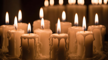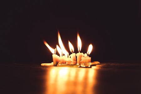 Group of white candles burning in the dark with soft glowing flames and melted wax drips on a reflective surface.