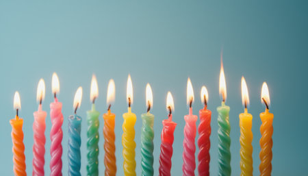 A vibrant array of twisted candles stands tall against a soft, pastel blue background, each flame flickering with warmth and joy. The playful colors—pink, yellow, green, and blue—create a festive atmosphere, evoking feelings of celebration and happiness, perfect for birthdays or special occasions.