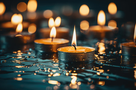 Small lit candles emit a warm orange glow on a dark textured surface with visible water droplets.