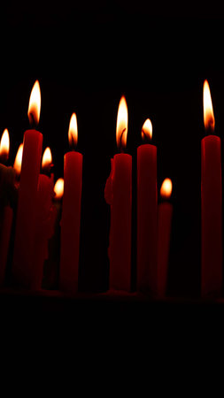 A close-up of lit candles in a dark room, creating a warm and cozy atmosphere.