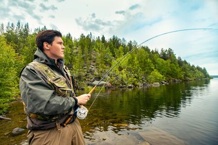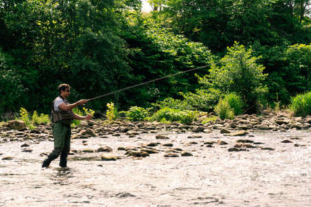 Fly fisherman using flyfishing rod in beautiful river.