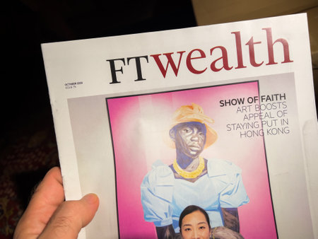 Reader male hand holding Financial Times FT wealth newspaper with show of faith about art boosts