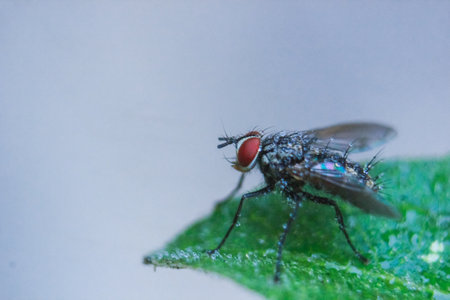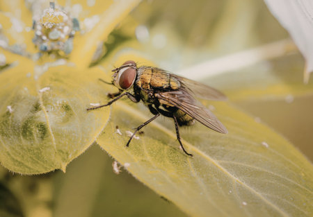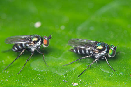 Close up a Fly on green leaf and nature blurred background, Common housefly, Colorful insect, Selective focus.