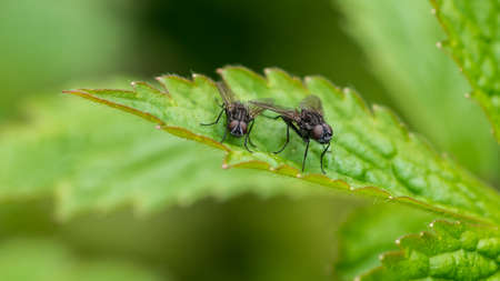 House flies in various natural gestures.Macro pictures of small insects that bring germs to people.