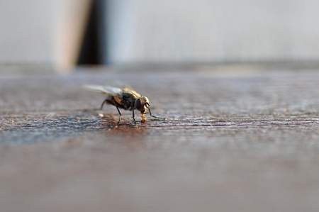 house fly in extreme close up sitting on piece dog food. Picture taken on grey wall