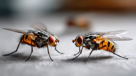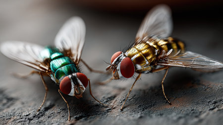 A stunning close-up image of two colorful flies, showcasing their vibrant colors and intricate details. The macro perspective reveals the beauty of nature's tiny creatures.