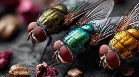 This vivid close-up image showcases colorful flies with intricate textures and patterns, set against a natural backdrop with food particles.