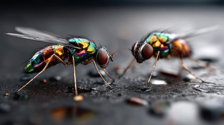 This close-up image showcases two colorful flies perched on a wet surface, highlighting their iridescent hues and intricate features in stunning detail.