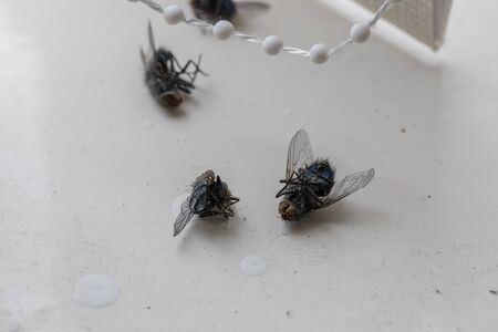 Dead blue bottle fly in close up. House flies killed by fly spray.