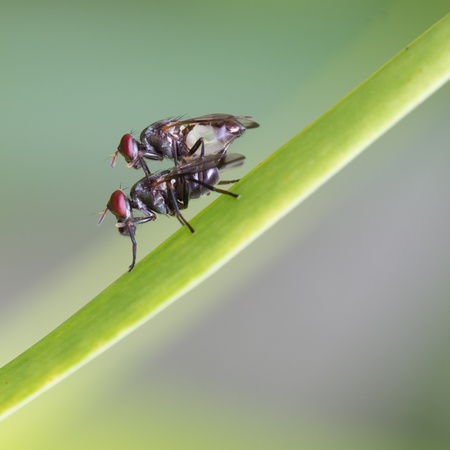 Pairing of two flies, close-up photography of the mating period of the flies. 2019
