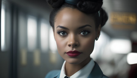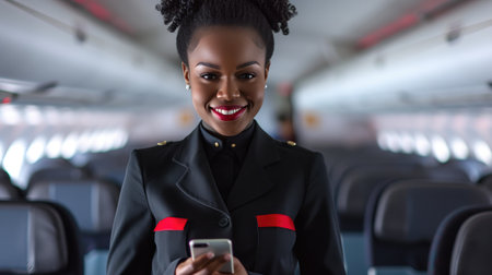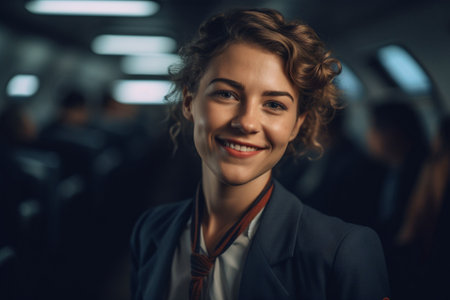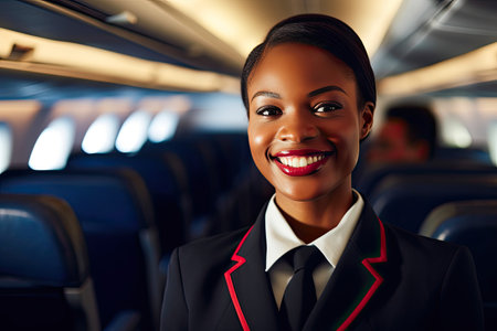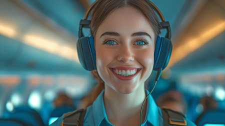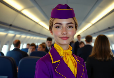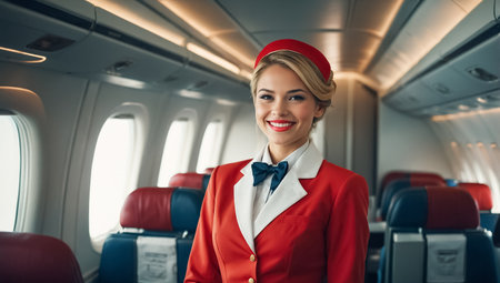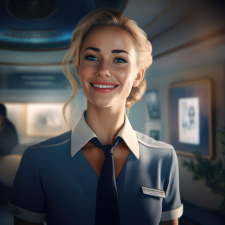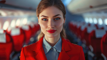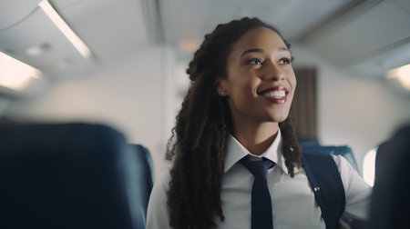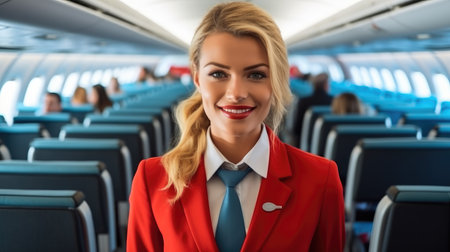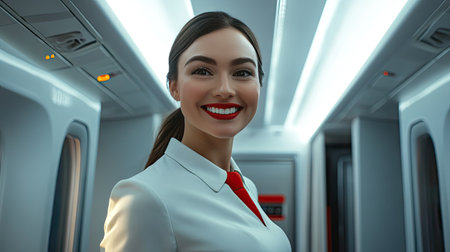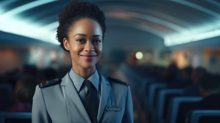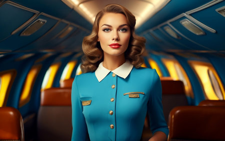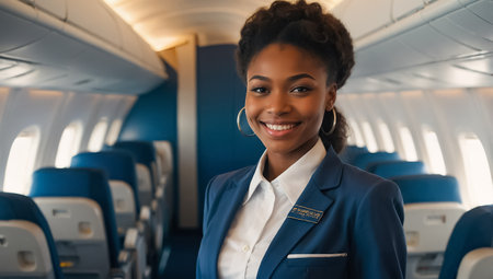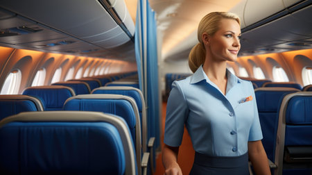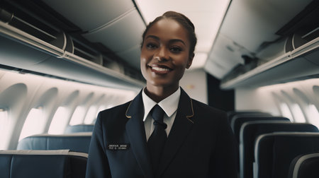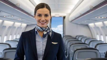 An AI generated illustration of a cheerful female flight attendant stands in an airplane cabin with empty rows of seats visible in the background