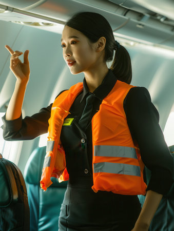 A flight attendant explains safety procedures wearing a life vest, ensuring passengers understand emergency protocols on board.