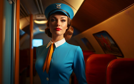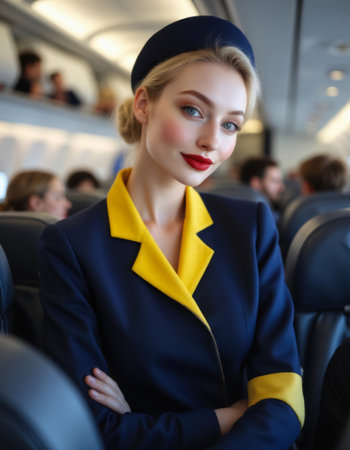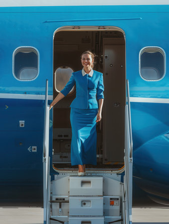 stewardess wearing a blue uniform stands confidently on the airplane.