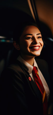 Businesswoman smiling during flight on airplane, enjoying comfortable and safe trip