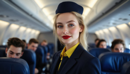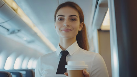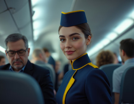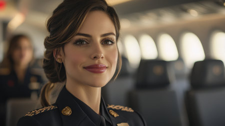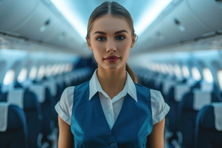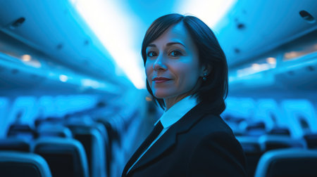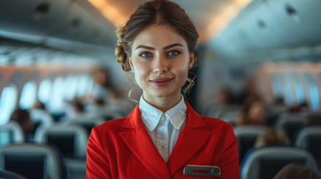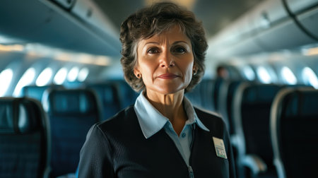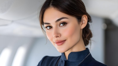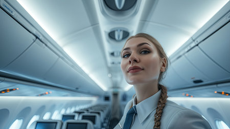 Confident female flight attendant standing in airplane aisle, portraying professionalism and hospitality in aviation.