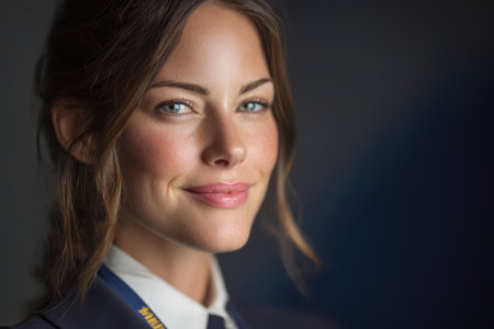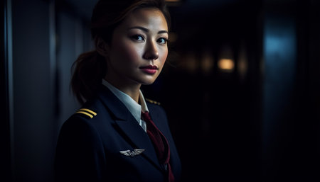 A woman in a pilot uniform poses inside an airplane cabin. Her long hair frames her face, and she looks directly at the camera with a serious expression.