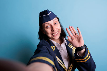 Smiling stewardess taking selfie first person view, airplane flight attendant making photo on smartphone front camera, fpv. Young attractive air hostess in air worker uniform portrait