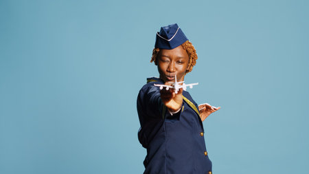 Female flight attendant with serious expression wearing crew uniform looking at camera while holding miniature model airplane. African american woman in studio shot with blue background.