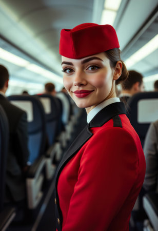 A professional air hostess standing at the front of the aircraft cabin, preparing for the flight with a poised and welcoming expression.