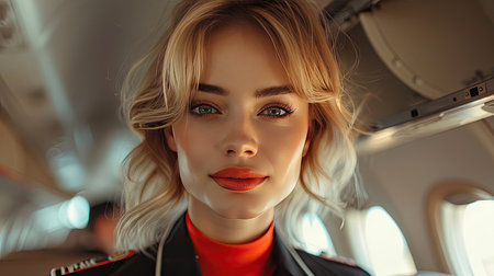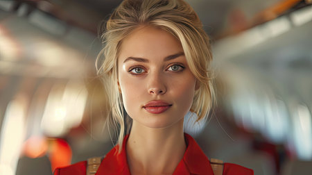 A flight attendant on board a passenger airliner. Beautiful flight attendant. Working for an airline.