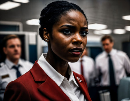 photo of rage angry black air hostess crew woman arguing the other with wound on face, generative AI