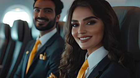 Generative AI Male and female flight attendants performing safety demonstrations, instructing passengers, airplane interior