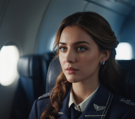 A young flight attendant in uniform sitting in an airplane seat - portrait