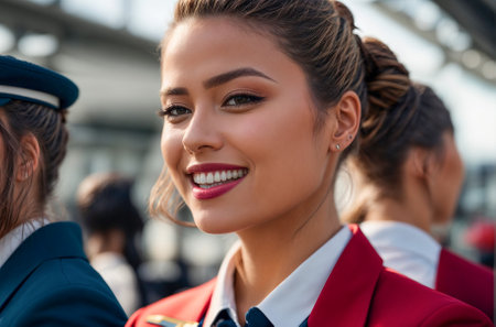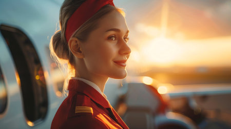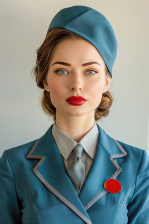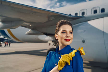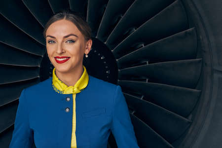 Beautiful portrait of airport worker and airplane and pilot's assistant, flight attendant, gorgeously stylish glamorous , flight stewardess