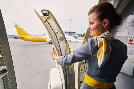 The flight attendant stands at the door of the aircraft, smiling warmly as she prepares to greet passengers.