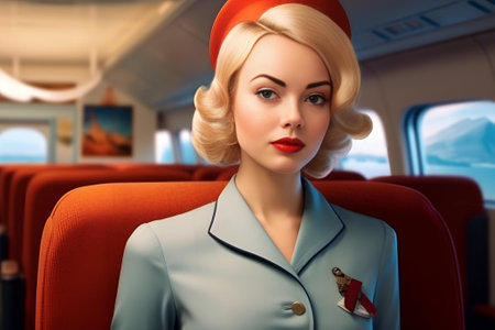 Portrait of charming blonde stewardess illustration in pin up style in plane