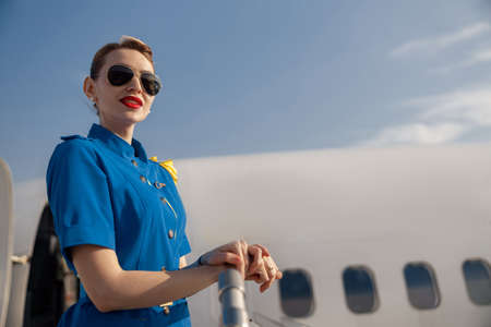 Portrait of pretty air stewardess in blue uniform and sunglasses looking away, standing on airstair on a daytime
