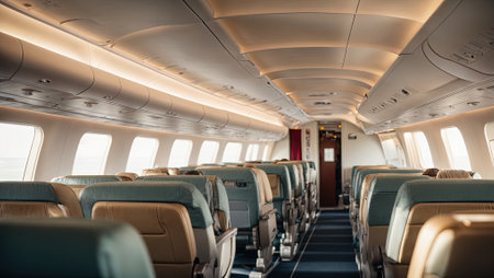 Empty passenger airplane seats in the cabin. Interior of passenger plane. Generative Ai
