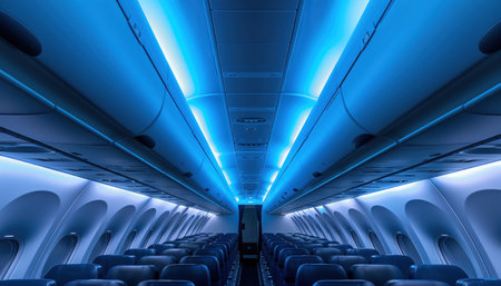 Modern airplane interior with ambient blue lighting on seats and ceiling for comfortable travel experience