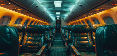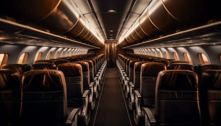 Empty airplane leather seat and windows of first class aircraft, illuminating the cabin with soft overhead lights. Generative AI