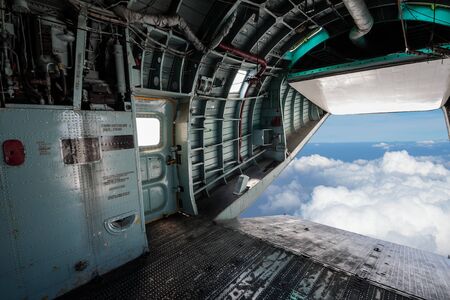 inside rear of military airplane in the sky