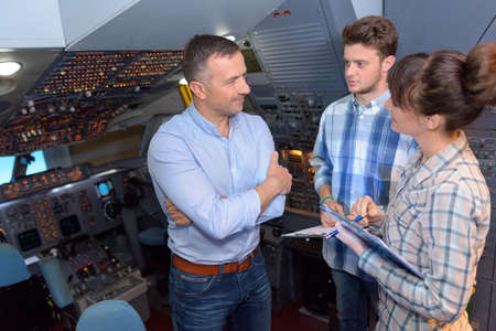 Diverse team of aviators throttling engine lever to takeoff, using handle and dashboard command to fly airplane. Control panel navigation with power switch in cockpit.