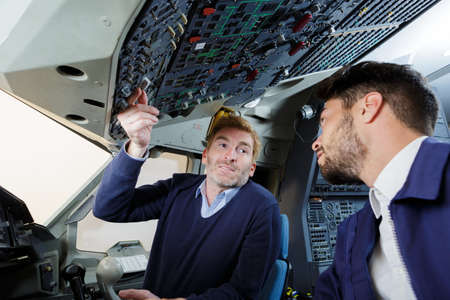 Male pilot pressing button on overhead panel in aircraft cockpit