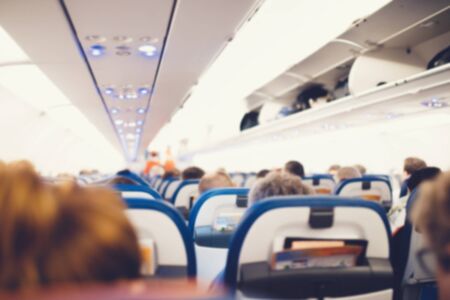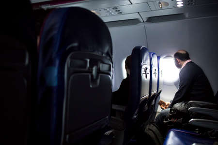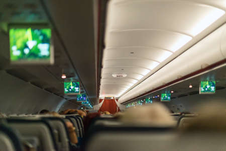 Passengers Inside the cabin of aircraft sitting on the chairs during the flight, selective focus