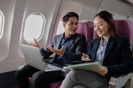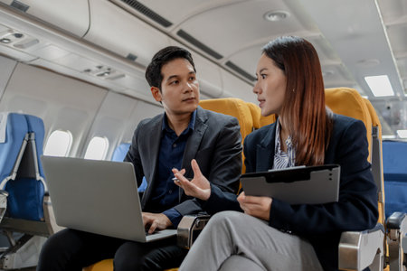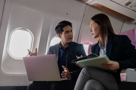 Asian businesspeople discussing work while flying on a plane. The man gestures as he explains something, while the woman listens holding a folder and pen, showing in-flight collaboration.