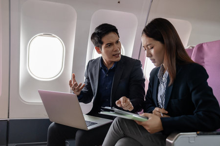 Two Asian business professionals discussing work during a flight, sitting in an airplane cabin. The man gestures seriously while the woman listens and holds documents and a pen, appearing focused.