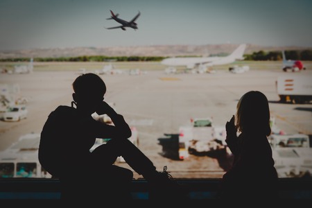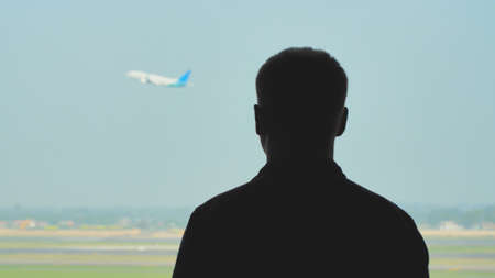 Silhouette of a young man watching the take-off of an airplane against a blue sky.